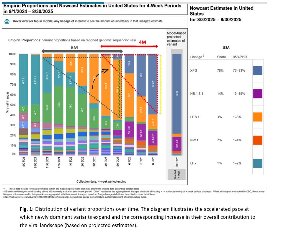 Beyond the increasing prevalence of chronic C-19 infections (as reflected in rising numbers of long COVID cases) and the heightened viral activity detected in wastewater, a marked rise in both the relative contribution of a co-circulating variant to the overall variant distribution and the speed with which it reaches dominance must be regarded as another critical harbinger of the imminent advent of HIVICRON (see figs. 1 and 2). This is because the enhanced infectiousness of a newly emerging co-circulating variant inevitably further increases population-level immune pressure on its transmissibility by virtue of its higher rate of chronic infection (see section 8. above).