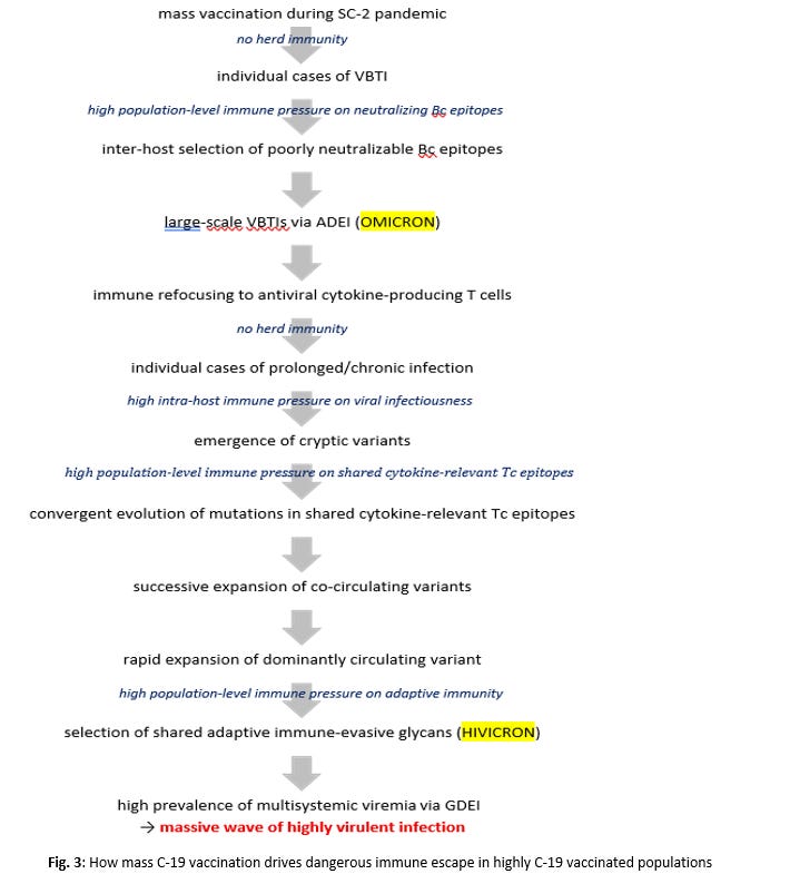 How C-19 mass vaccination ultimately drives highly C-19-vaccinated populations to exert immune selection pressure on these cytokine-related viral epitopes and why I am convinced that repeated VBTIs will eventually trigger a massive wave of high viral virulence, and thereby create a major safety concern, is described under section 9.